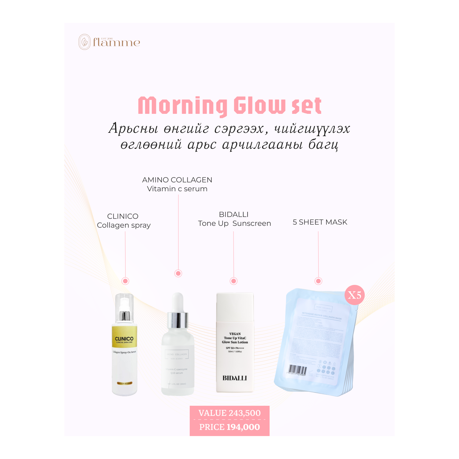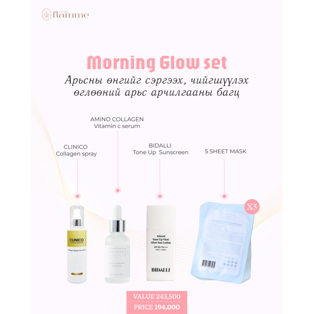 Та бүхэндээ өглөөний арьс арчилгааны бас нэгэн цуврал болох “ Morning Glow set ’’ багцаа танилцуулж байна. Энэхүү багц нь коллаген болон ц витаминаар баялаг тул чийг тэжээлээр ханган, арьсны өнгийг сэргээн цайруулж, будгийн шингэлт сайжруулах давуу талтай. Мөн цоо шинэ BIDALLI брэндийн маань маш гоё Tone-Up чийгшүүлэх, гялалзуулах үйлчилгээтэй нарны тос багтсан учраас эрүүл гэрэлтсэн арьсыг өдрийн турш бэлэглэнэ. Өглөөний арьс арчилгааны бүх бүтээгдэхүүнийг нэг дор багтаасан “ Morning Glow set ’’ багцаа санал болгож байна.