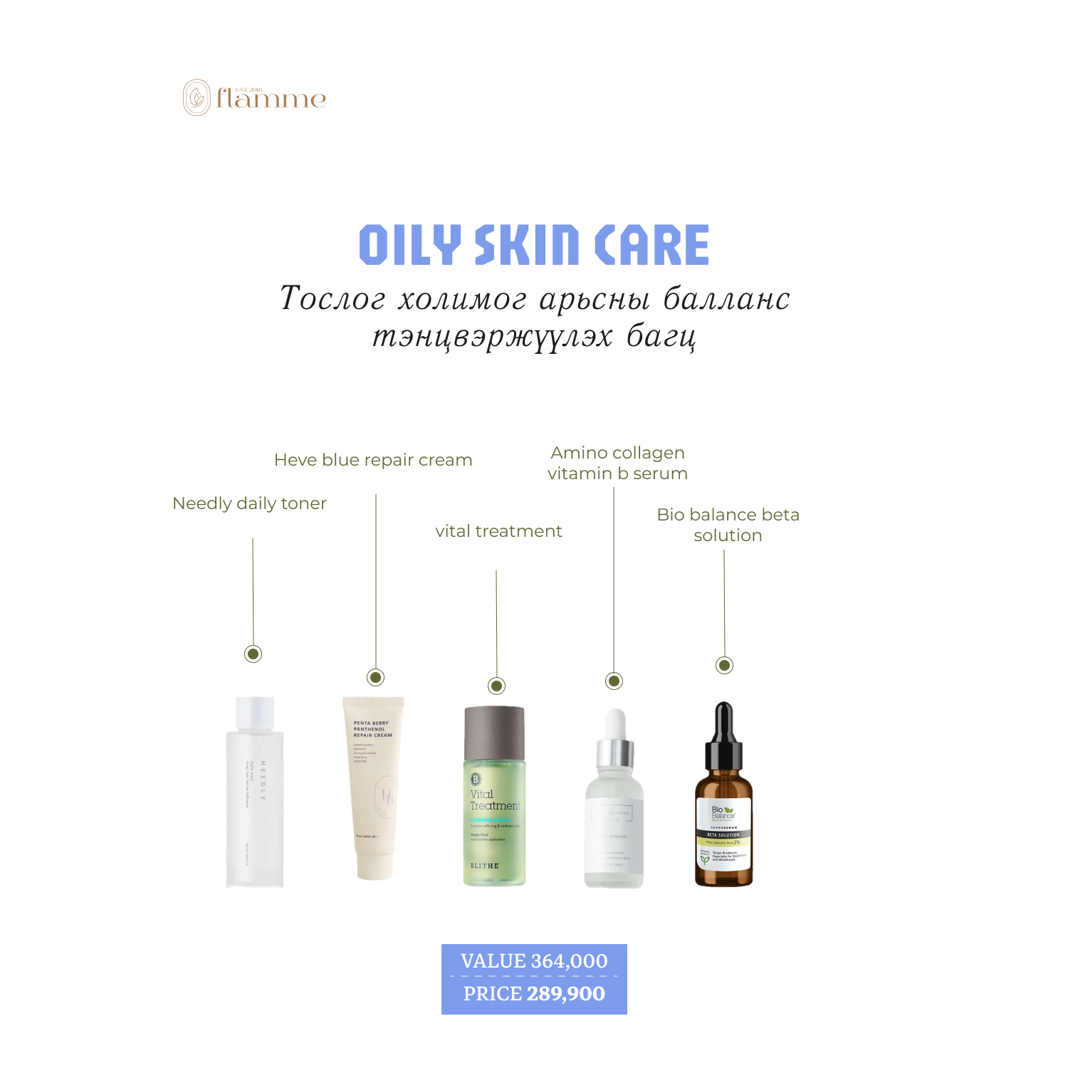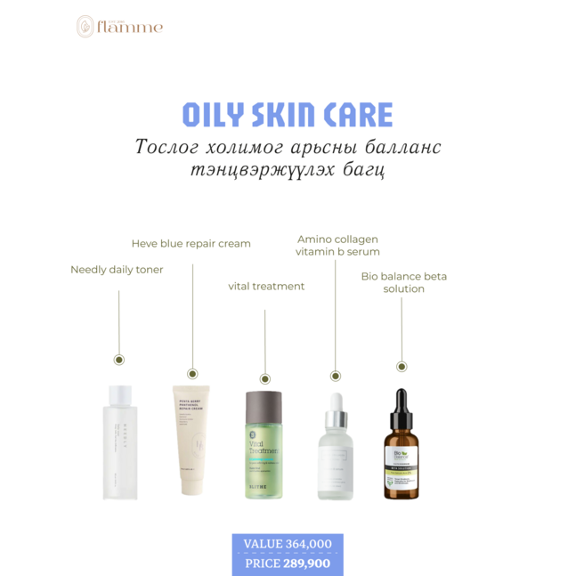 Тослог холимог арьсны '' OILY SKIN CARE '' багц шинээр гарлаа. Энэхүү багц нь дотроо Needly брэндийн өдөр тутмын гуужуулагчтай цэвэрлэгээний тонер, BLITHE тайвшруулах, чийгшүүлэх эссэнсэ болон өнгөн гадаргууг бэхжүүлж, арьсны липидийг нэмэгдүүлэх витамин B серум, Bio balance брэндийн салицилийн хүчилтэй арьсны тос усны балансыг тэнцвэржүүлэх, нүхжилт агшаах серум, 5 төрлийн жимсний орц найрлага бүхий арьсны бохирдлыг арилгах, арьсны өнгийг сэргээх хөнгөн бүтэцтэй тайвшруулах нүүрний тос багтаасан.