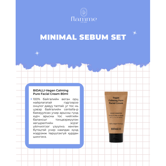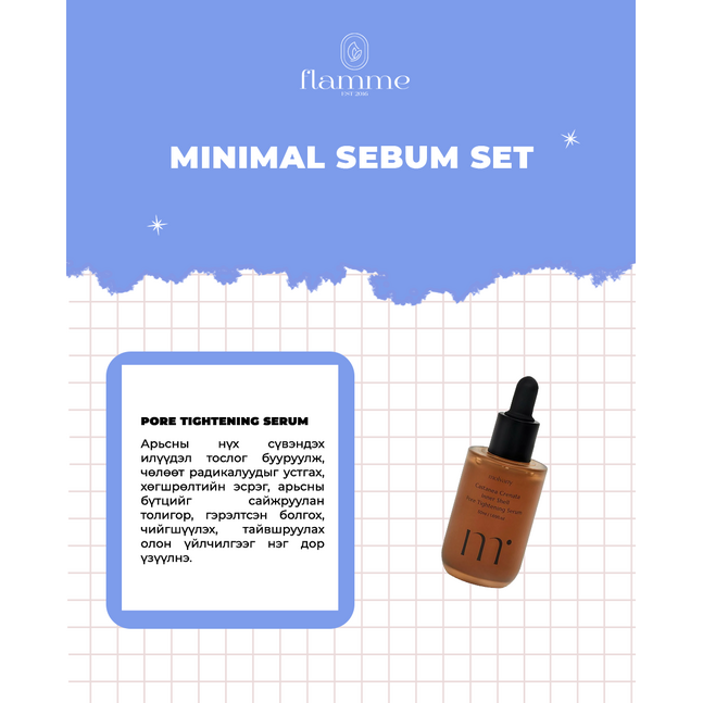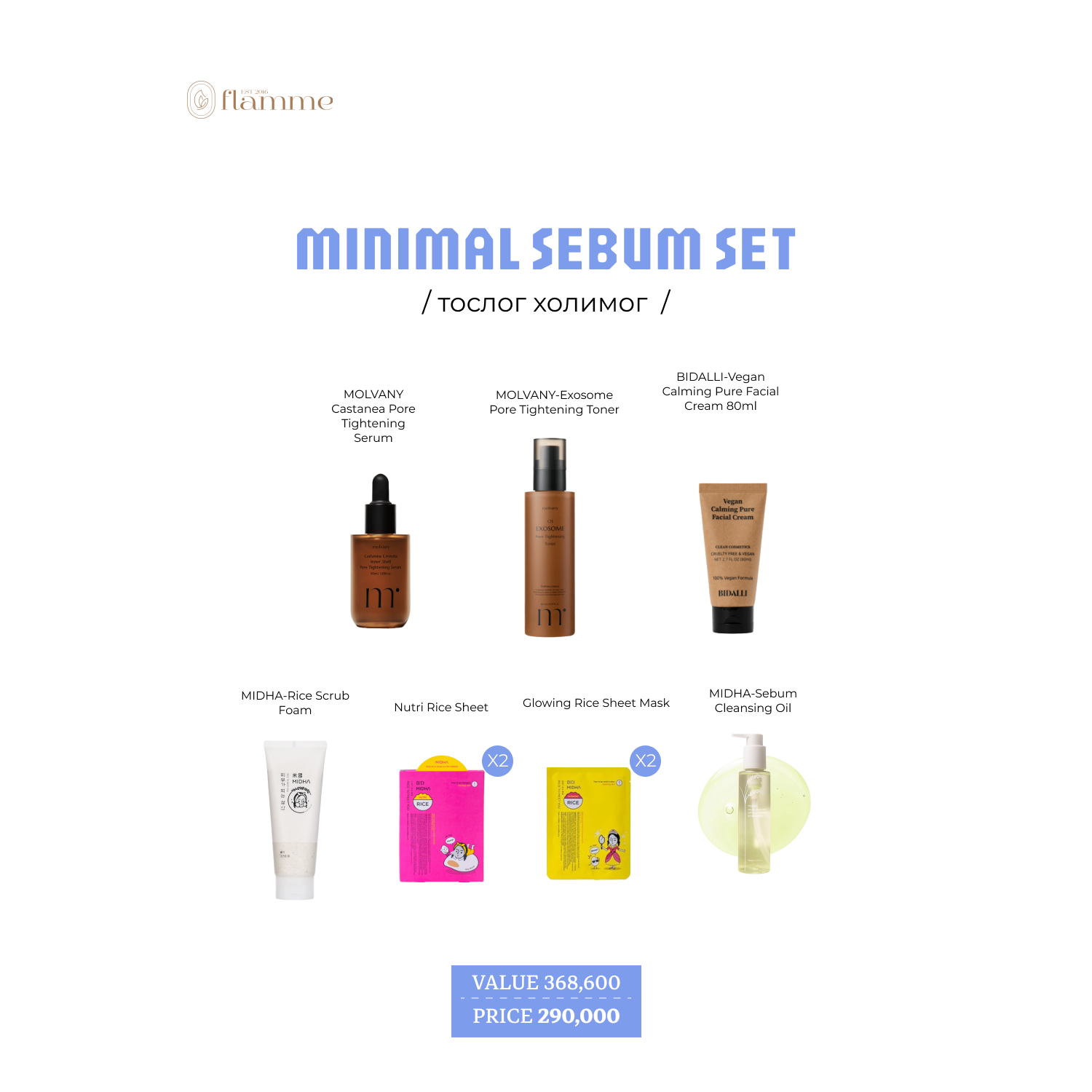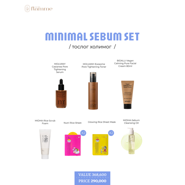 Нүхжилттэй тослог ялгардаг арьсны тослогийг тэнцвэржүүлэн нүхжилт агшаах, чийгшүүлэх үйлчилгээтэй. Энэхүү багц нь цэвэрлэгээнээс эхлэн арьс арчилгааны бүхий л бүтээгдэхүүнийг нэг дор багтаасан ба цөөхөн бүтээгдэхүүнээр асуудлаа шийдэх боломжийг олгож байна.